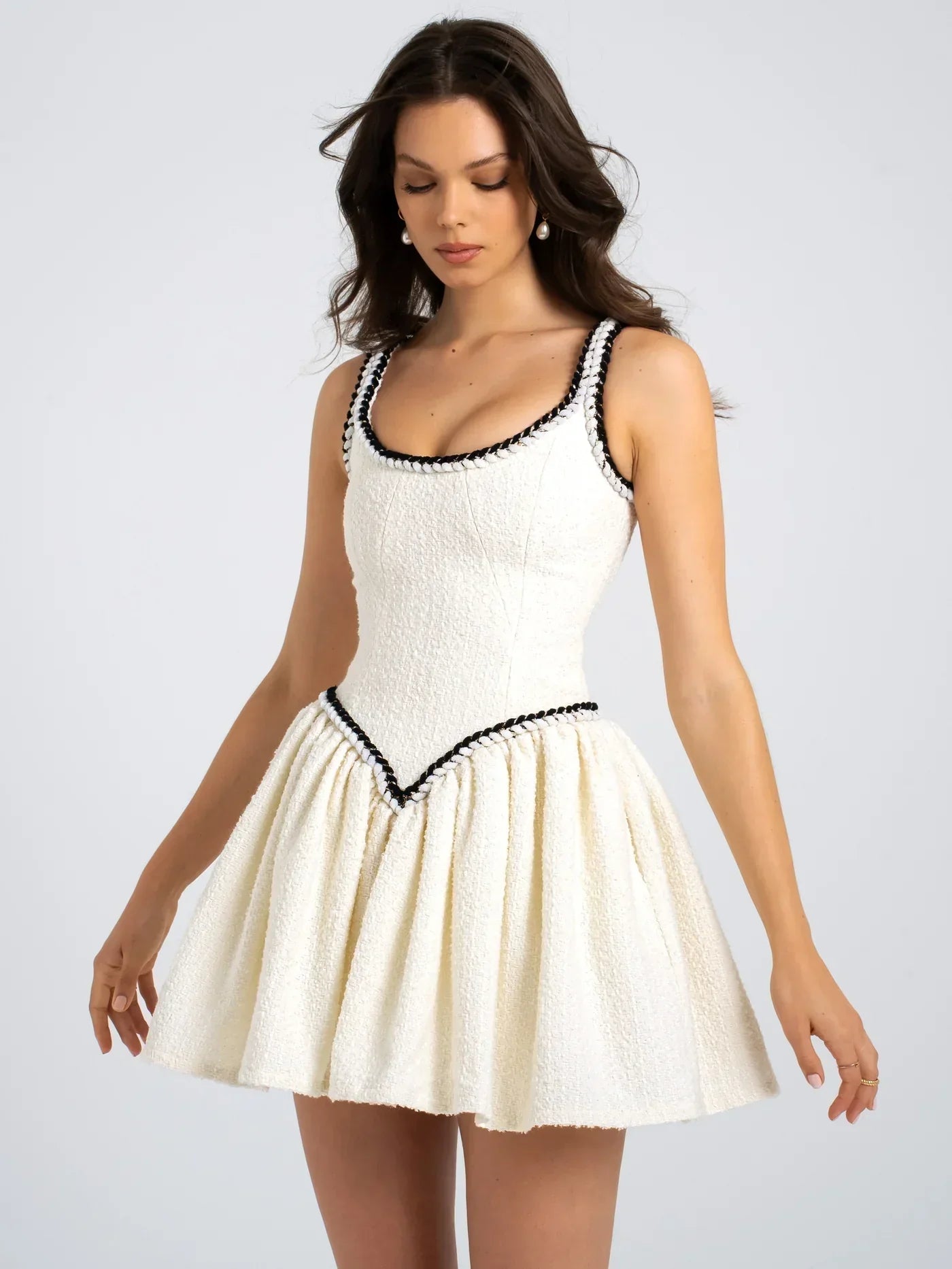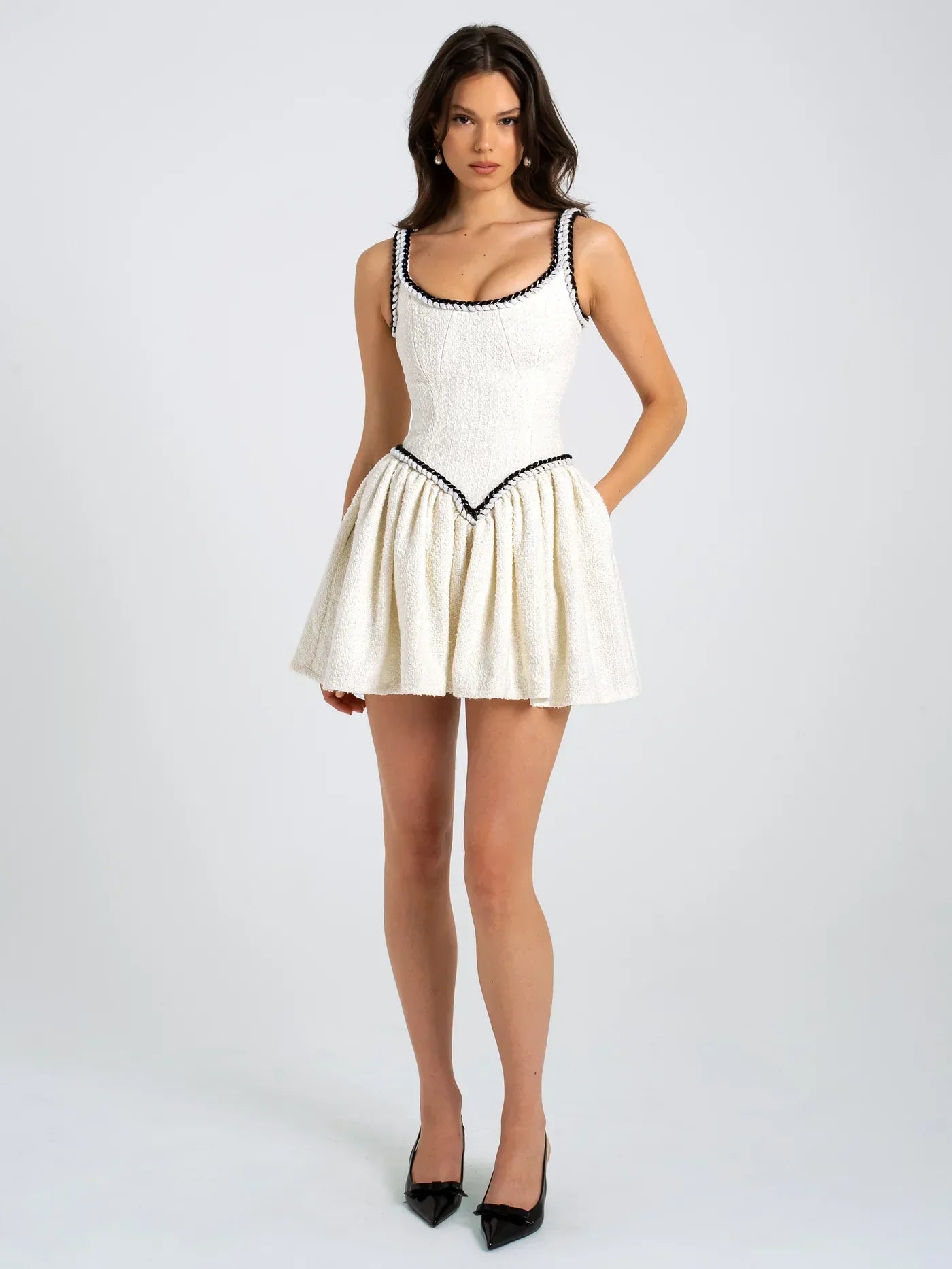 Bu kontrast bağlama detaylı pliseli tweed kısa elbise, sofistike ve modern tasarımıyla günlük şıklık, düğünler, tatil ve özel davetler için mükemmel bir seçenektir. Tweed kumaşı, klasik ve zarif bir hava katarken, pliseli etek tasarımı hareketli ve feminen bir siluet oluşturur.