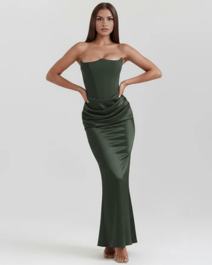 Valerienna’nın sadeliği lüksle buluşturduğu bu tasarım, özel günlerinizde abartısız bir ihtişam yaratmanız için tasarlandı. Vücudu sıkıca saran straplez korsaj üst, belinizi ince gösterirken; kalça kısmındaki özel drape detayları feminen kıvrımlarınızı sanatsal bir dokunuşla belirginleştirir.