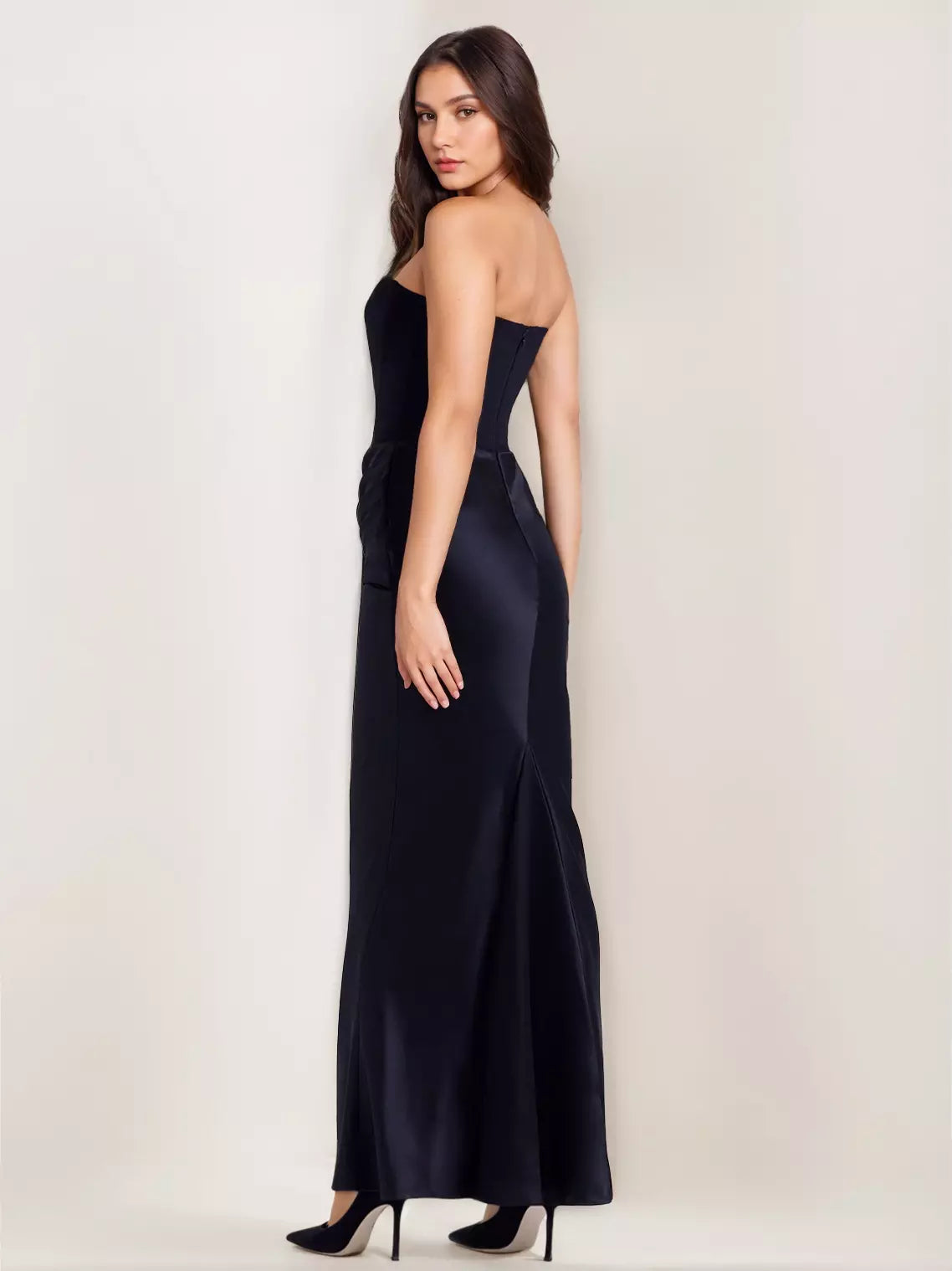 Elbisenin zarif sadeliğini bozmamak için ince bantlı topuklu sandaletler en iyi tamamlayıcıdır. Straplez kesimi vurgulamak için boynunuzda minimal bir pırlanta kolye veya choker kullanabilir, saçlarınızı geriye doğru taranmış ıslak görünümlü bir modelle şekillendirebilirsiniz.
